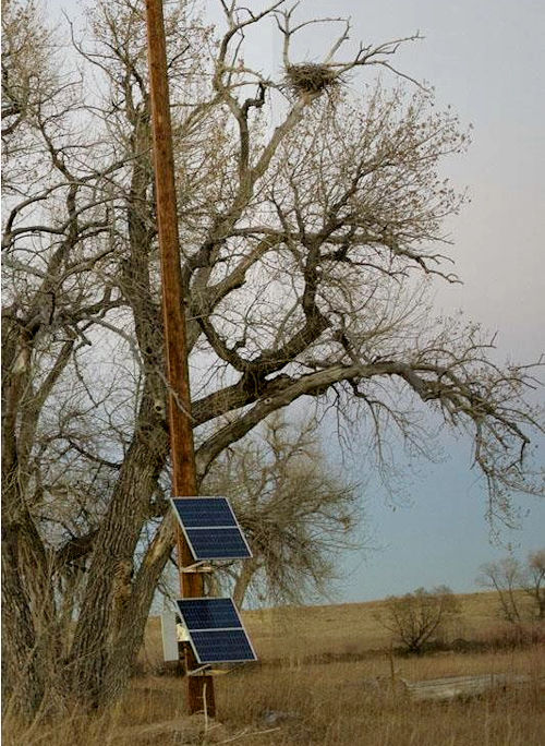 as of 2019, male has one band on left leg, female has two bands There are four cams on this nest, two overhead and the other two looking from the side; the intent is to have one of each online, with the other as backup, but both overhead cams failed early in the nesting season; they streamed both side view cams for a while, but are now down to one sideview cam. They are continuing to try to add sound, but still haven't succeeded at that. The cam is solar-powered, so will be shut down from dusk to dawn to conserve power and might be a bit uncertain on very dark days. There are also photos for the day saved in four-minute increments, so you can see what has happened in the previous 24 hours. The cam is often offline during the fall and winter, and is back online in February. Well, things were slightly better in 2013 - the adults again laid three eggs, and they all hatched. Sadly two of the chicks were lost in mid-April as a result of a large snowstorm, which deposited over a foot of snow on the nest when the chicks were only about two weeks old. The remaining eaglet was renamed "Survivor" by those watching the cam, and fledged successfully. As of November 2013 we're not sure if there will be a cam next year - the nest tree is near the banks of the St. Vrain Creek and is in the area that was flooded in the historic flooding in Colorado from September 10 to September 13. The nest tree is still standing, the nest looks OK and both adults have been seen - but the camera equipment and the solar panels were covered with 5 to 7 feet of water. The weather was still an issue in 2014, but not as severe as the previous year; the pair laid three eggs, all of which hatched; the middle chick ("Argos") died when he/she was a little over a month old, after a week or so of wheezing and difficulty breathing; the other chicks ("Amara" and "Ajax") fledged successfully, though the younger Ajax was observed wheezing occasionally. 2015 was another challenging year here. The pair laid three eggs, and all three hatched, but the youngest D30 died at four days old after ending up outside the nest bowl, perhaps injured or maybe just stuck as the temperature fell, and then there was a bad storm when the remaining chicks were about 3 weeks old, and they didn't both fit under Mom and the one who was more exposed didn't make it (we think the younger, but can't be sure); the remaining chick (nicknamed "Aspen") fledged successfully. 2017 was better - they again laid three eggs, two of them hatched - and those chicks fledged successfully! The pair laid three eggs in 2018, and FSV36, FSV37 and FSV38 fledged successfully. There were three eggs again in 2019, two hatched, and FSV39 and FSV40 fledged successfully. Xcel stopped streaming the cams early in 2020 to conserve bandwidth for essential functions, but provided reports so we know there were three eggs, two of which hatched; one chick was lost in a spring snowstorm (probably younger FSV42), but it was reported that FSV41 fledged successfully. The cams were back for 2021 and observers noticed the male had a band on the right leg while the previous male's band was on the left leg, so there was a switch at some point; the pair laid three eggs but one broke when a chunk of ice fell on it from a branch overhead; the other two hatched, but older FSV43 died of unknown causes after a day and a half; FSV44 fledged successfully and was captured after fledging, banded, and equipped with a tracking tag; they determined that he was male.