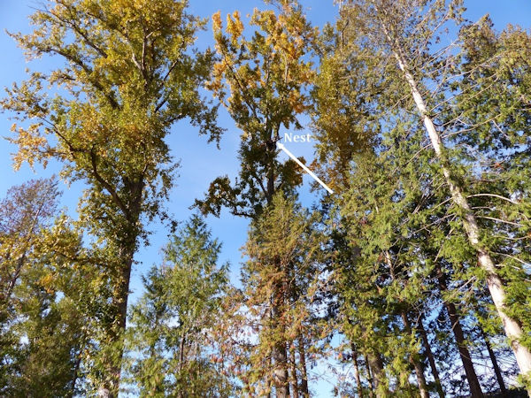 This nest is located in a tree in a small park in a residential area of Burnaby, BC. It's unusual not only for being is such a populated area, but for being in a tree with leaves that hide the nest (parents generally seem to prefer an unobstructed view from the nest), and for being several miles from the nearest body of water large enough to catch fish. This nest successfully fledged 2 eaglets in 2007, and fledged 2 eaglets in 2008, though one had poor feather development on its wings, making us wonder how that would affect its survival. The eagles haven't nested there since 2008.