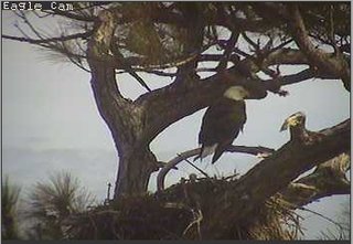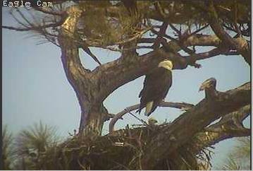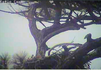The direct link to the cam is http://74.95.63.177/ password public (in both places - you may need to enter it twice). The eagles here are named George and Gracie. The original George died in 2006 and Gracie found another mate George II. Gracie appears to be about 20 and George II appears to be much younger. Gracie continued her success by fledging eaglets with George II in 2007.