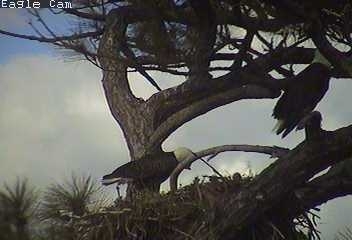 JudyB: Well, there may be a problem - it's been exceedingly windy in that part of Florida - and we've only seen one eaglet in the nest this morning. We're hoping that the missing eaglet is branching off-camera and will figure out how to return soon - but he missed a food delivery, which suggests that he hasn't figured out how to get back from wherever he is. It looks to me as if the missing one is Little Bro - the more advanced flapper and brancher - so there's a good chance he was able to make it to safety somewhere if he was blown out by a gust while doing his patented high jumps. And the parents will feed an eaglet wherever it is, so he'll have food while he continues to develop the wing strength needed to return to the nest.