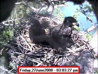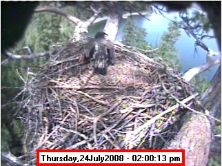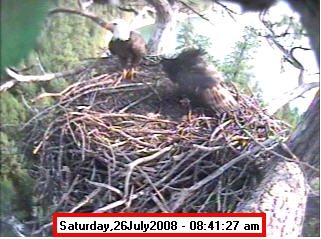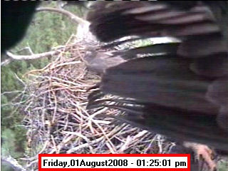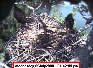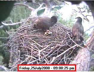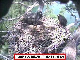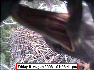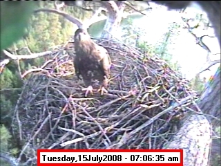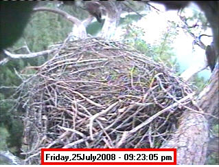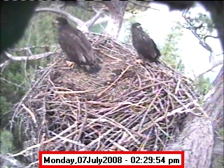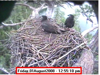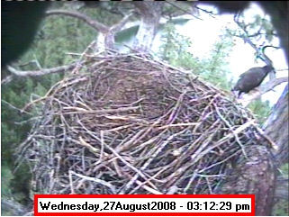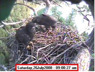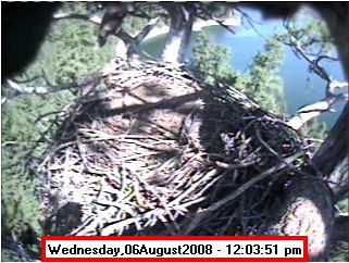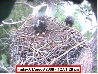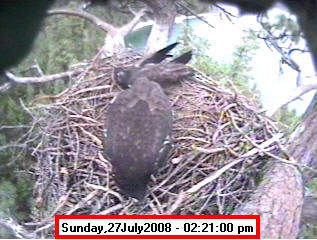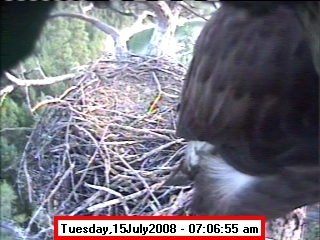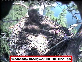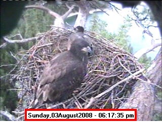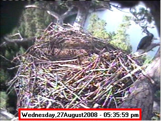 ![]() JudyB's photos - August 27, 2008 (older is almost 18 weeks old) One fledgling was seen at the nest for a couple of hours in the late afternoon on both August 26 and 27; that was the last time we saw either of them at the nest. They were about 17-1/2 weeks old, and had been flying for around 6 weeks. Fare well. |