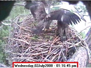 At first glance, I saw the head of the eaglet standing on the right side of the nest, and wondered where the other eaglet was. And then I saw the big foot right in front of the camera! I think the one at the back of the nest was jumping down from a branch in the second shot. The first picture of this pair shows both of them branching - the second eaglet is in the upper left corner of the picture - you can see the tail sticking down below the branch. One of them spent a lot of time up on that branch while I was watching them. The second picture is one of many I took showing them moving around the nest. |